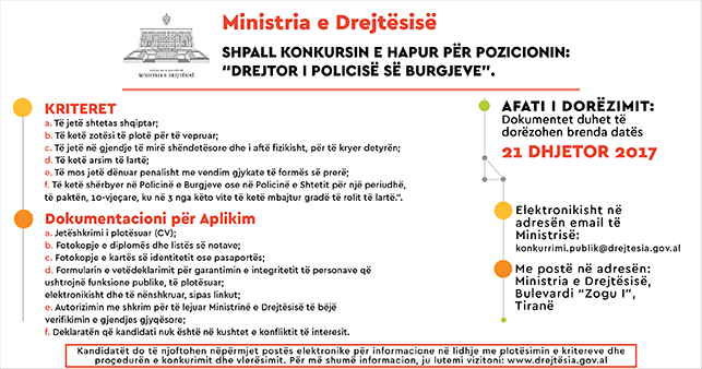 Kandidatët për pozicionin “Drejtor i Policisë së Burgjeve” duhet të plotësojë kriteret e përgjithshme