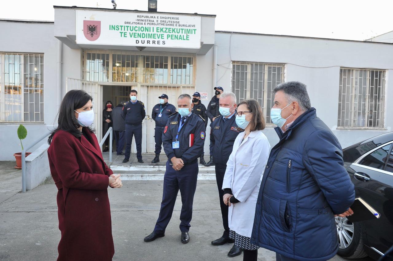 Ministria e Drejtësisë, Etilda Gjonaj ndërmori sot një inspektim blic në burgun e Durrësit për të verifikuar në terren masat parandaluese anticovid, kushtet e personave të dënuar dhe të paraburgosur, si edhe për të mbështetur punën e punonjësve të policisë së burgjeve dhe stafit civil në këto kohë pandemie.