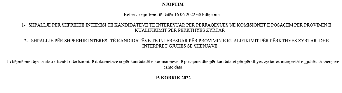Ju bëjmë me dije se afati i fundit i dorëzimit të dokumeteve si për kandidatët e komisioneve të posaçme dhe për kandidatet për përkthyes zyrtar & interpretët e gjuhës së shenjave është data