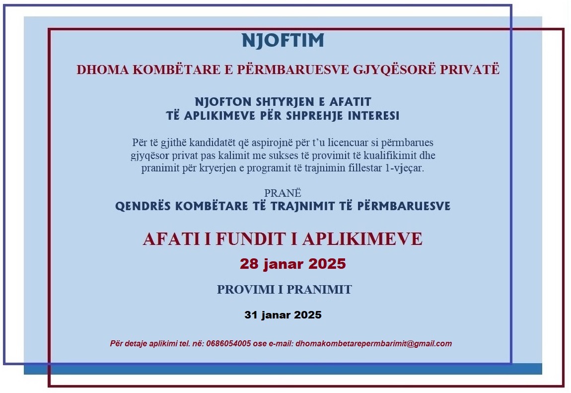 Rihapet thirrja për shprehje interesi për hyrjen në provimin e pranimit në trajnimin fillestar”, për 12 vende vakante për kanditat përmbarues në vijim të Urdhrit nr. 702, datë 18.12.2023 të Ministrit të Drejtësisë, sipas tekstit bashkelidhur.